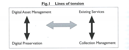 The advent of digital technology has stretched the range of skills and knowledge expected of us. But there is now a real tension, not just between these two extremes on the digital axis, but between this axis and its non-digital parallel [see Fig. I]. As our organisations attempt to manage the processes that correspond to existing services and collection management while introducing, as quickly as possible, new processes for digital it has become clear that resources cannot be stretched to such a degree. We need help.