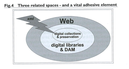 The rest of this presentation will develop these four themes and mostly takes the form of a record of ideas and projects I've encountered on a journey taken over the last six months through a landscape made up of the three related spaces I've already drawn - digital collections, digital libraries, and the Web. It's a landscape in which our work as individuals, and as individuals within groups can find the inspiration to work together in order to attempt to preserve collections on the scale we have set out to achieve. It's a landscape in which the provision and discovery of knowledge in electronic form can be managed and in which our institutions and the people that work in them can thrive rather than merely survive. And if these three spaces seem today like separate spheres of activity, physically, as well as logically, then as our work becomes more diffuse and collaborative, so the spaces become more homogeneous. There is one vital ingredient that needs to be added to our scheme: metadata, without which the content in our collections remains a jumble of bits. Metadata in the specific and, I believe, soon to be ubiquitous guise of the extensible mark-up language, or xml.