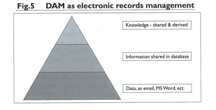 I think there is another important dimension to our engagement with DAM, and that is its application to the knowledge that exists in an organisation, whether categorised as explicit or tacit. This could be described as digital asset management in the form of electronic records management and it sits alongside the commercial functionality just described.